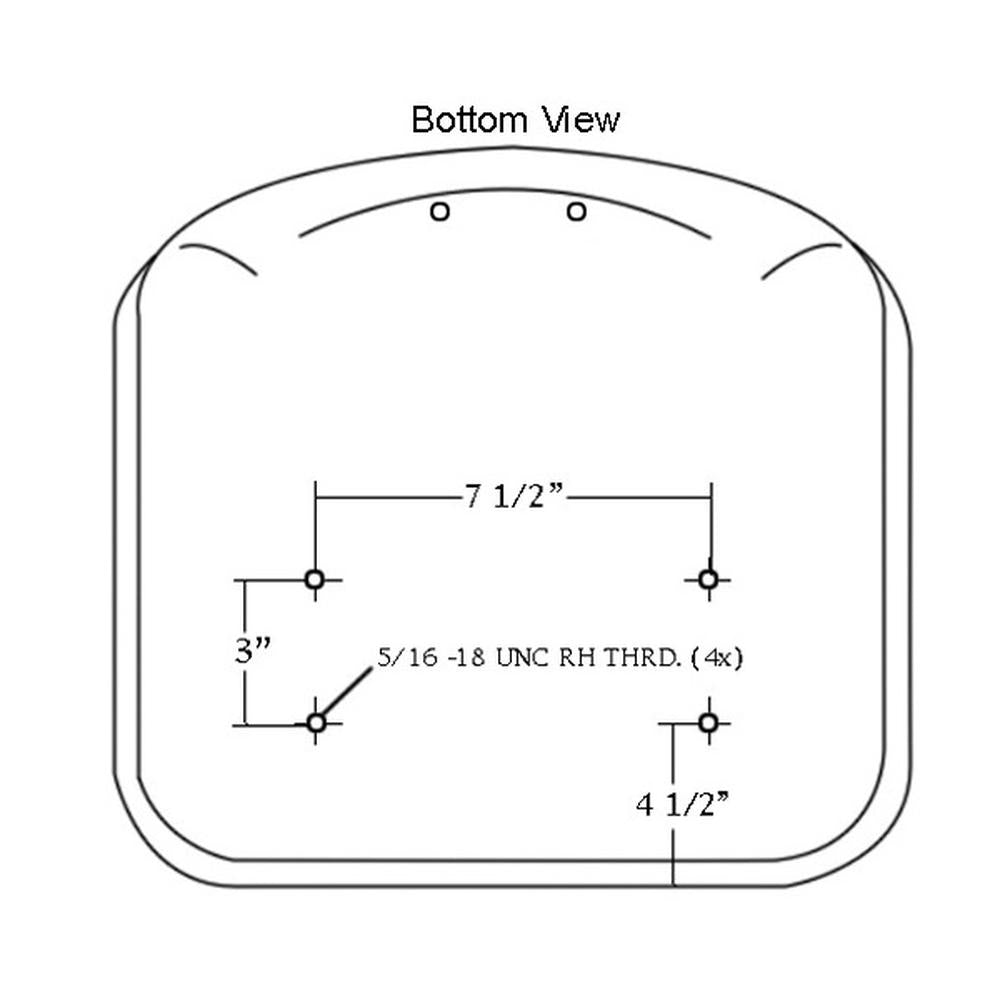 - Bottom View Measurements: 3" distance between top & bottom bolts, 7 ½" distance between left to right bolts, 4 1/2" from front of seat to first bolt, 5/16" 18 UNC RH THRD.