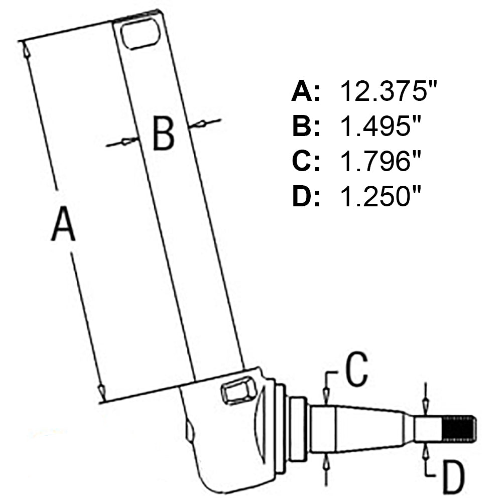 This Is a Heavy Duty Version of the 508571M92 Spindle. If Replacing This Spindle, You Must Also Replace Wheel Hub W/ Part # 532781M92 & Wheel Bearing Kit WBKMF3 Some Models Have Multiple Spindle Options. All Dimensions Must Be Checked Before Ordering Right or Left Side Dimension A: 12.375" Dimension B: 1.495" Dimension C: 1.796" Dimension D: 1.250"Reference Numbers: